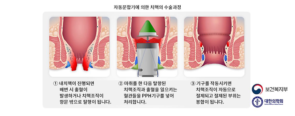 하지만 보존적 치료법으로 증세가 호전되지 않거나 합병증이 동반되어 있는 경우에는 치핵 자체를 제거하는 외과적 치료를 고려해야 합니다.