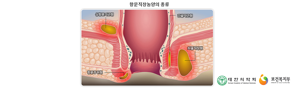 이렇게 발생한 초기 염증은 주위 조직으로 파급되어 다양한 종류의 항문직장 농양을 일으키는데, 농양이 발생한 위치에 따라서 크게 다음 네가지 형태로 구분됩니다.