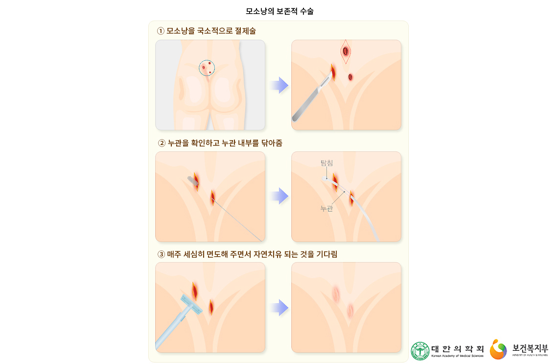 과거에 만성 모소낭의 치료는 광범위한 절제를 원칙으로 하고, 절제 후 남은 창상에 대해 여러 가지 방법이 동원되었습니다. 그러나 근래에는 보존적 수술이 효과도 좋고, 재발률도 낮아 모소낭 치료에 많이 이용되고 있습니다. 또한 국소마취가 가능하며 창상치유 기간도 짧아 입원 기간이 짧아지거나, 입원하지 않고 외래에서 치료하는 경향도 늘어나고 있습니다.
