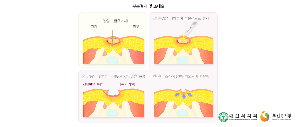 둔부열의 창상은 치유가 더디므로 농양의 절개 배농 시 가급적 정중선 외측을 세로로 절개합니다. 피하지방층까지 절개한 후 농양낭으로 접근하여 배농시키고 모발이 있으면 제거해야 합니다. 주변의 염증이 심하지 않으면 항생제는 필요 없으며, 샤워나 좌욕으로 창상을 청결하게 유지하고, 창상 주위 모발은 적어도 10-14일에 한 번씩 뽑거나 면도를 해야 합니다. 모발관리는 상처가 좋아진 후 적어도 3개월은 지나고 시행해야 합니다.