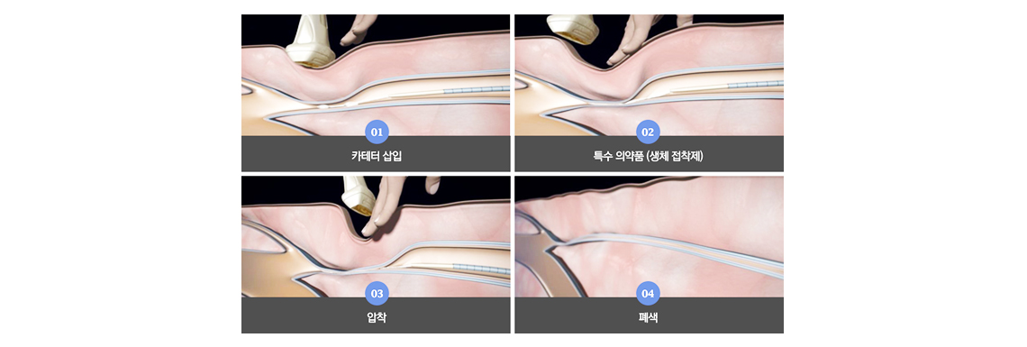의료용 접착제인 시아노아크릴레이트를 이용하여 역류가 발생한 혈관 부위를 접착시켜 역류를 차단해 주는 치료법으로 접착된 정맥은 시간이 지나면서 체내로 자연스럽게 흡수되어 없어지게 됩니다.